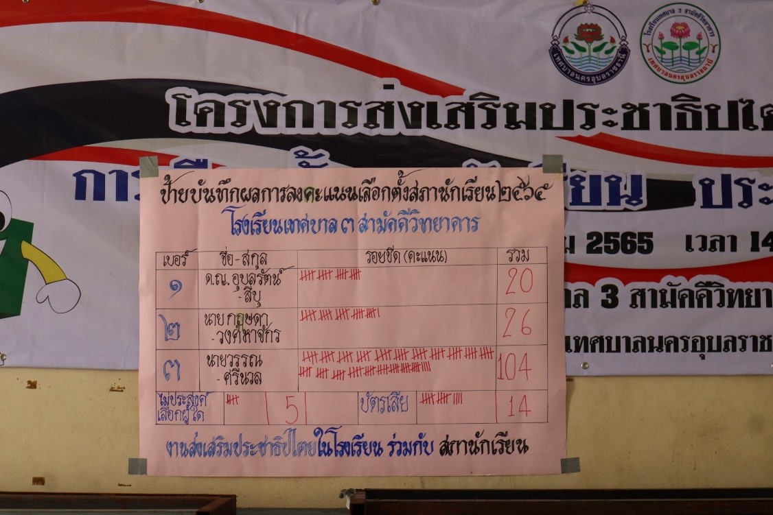 โรงเรียนเทศบาล 3 สามัคคีวิทยาคาร สังกัดสำนักการศึกษา เทศบาลนครอุบลราชธานี ภายใต้การบริหารงาน ของ นางสาวพิศทยา ไชยสงคราม นายกเทศมนตรีนครอุบลราชธานี โดย นายปรีชา สุขศรี ผู้อำนวยการสถานศึกษา มอบหมายให้ ฝ่ายกิจการนักเรียน ดำเนินการจัดกิจกรรมเลือกตั้งสภานักเรียนประจำปีการศึกษา 2565 ตามโครงการส่งเสริมประชาธิปไตยในโรงเรียน เมื่อวันที่ 27 พฤษภาคม 2565 ณ อาคารเรียนอุทุมพร